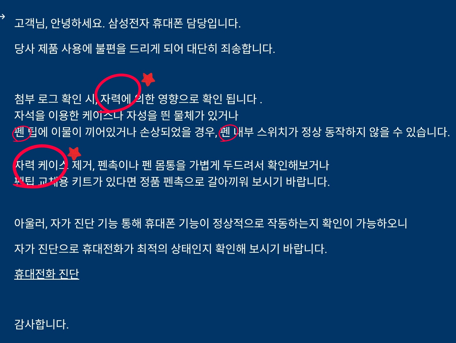 5분 안에 삼성 멤버스 앱으로 영상이나 사진을 첨부해 문의해보라고 하시더라고요.